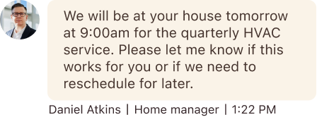 Direct line to your Home Manager and technicians. Ask questions, share concerns, or provide access instructions without playing phone tag.